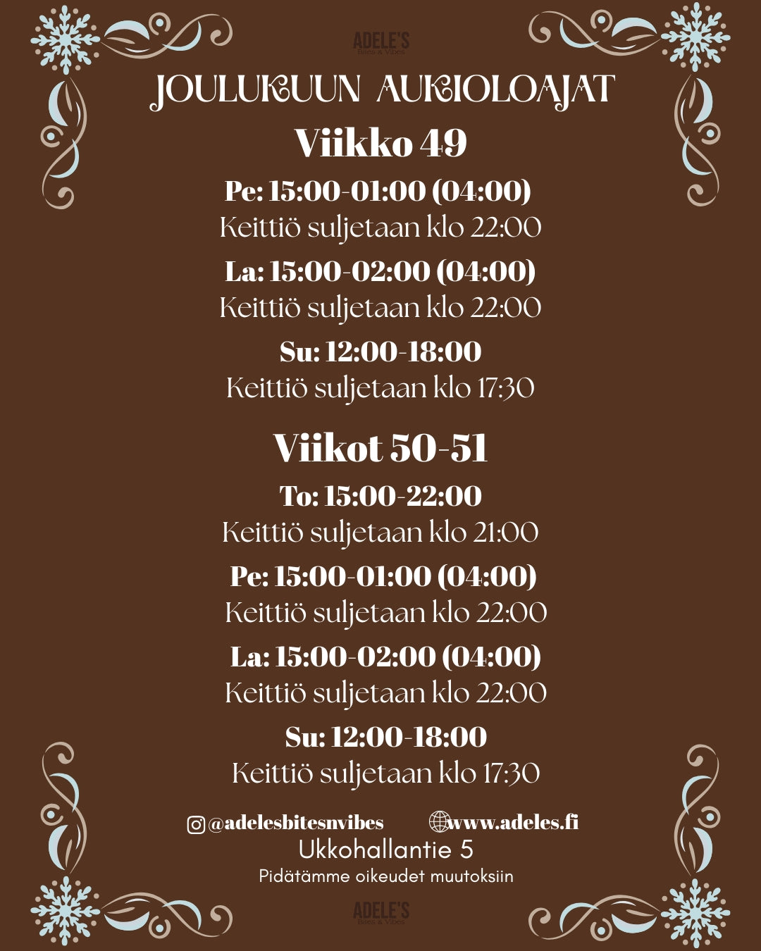 Adele's Bites & Vibes on ravintola Ukkohallassa, jonka tarkoituksena on luoda sinun mökkireissustasi entistäkin enemmän rentouttava. Laadukkaat raaka-aineet, ystävällinen palvelu, hiottu reseptiikka sekä halu tehdä hyvää ovat asioita joista meidät on rakennettu. Tilamme ovat tarkoitettu samalla olohuoneeksi, johon juuri sinä olet aina tervetullut. Työmme tulee suoraan sydämestä, tule ihmeessä katsomaan mitä se käytännössä tarkoittaa! Nähdään Ukkohallantie 5:ssa :) Ps. Meillä on kotiintoimitus (mökille toimitus tässä tapauksessa) pizzoille. Soitellaan!